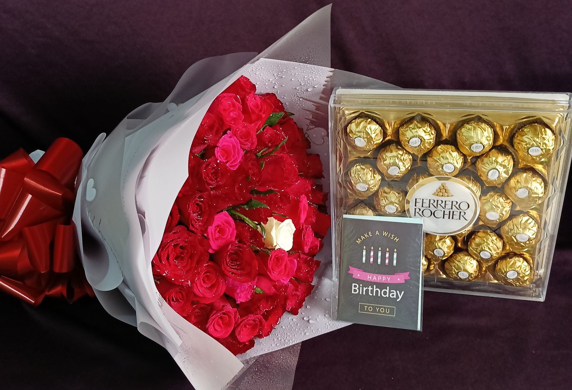 Flower bouquet, chocolate and birthday gift card