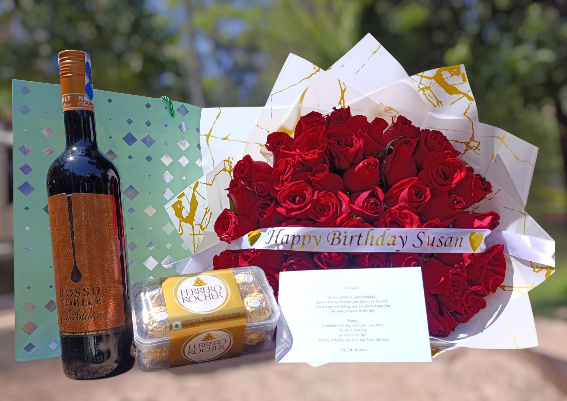 Flower bouquet, chocolate,wine and birthday gift card